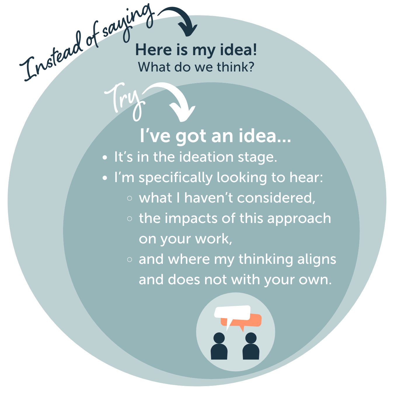 Now consider this: You present your idea, and then you tell your team that you're still in the ideation stage. You go deeper by explaining, "I'd like to hear what I haven't considered. What will the impacts of this approach be on your work? Where does my thinking align or not align with yours?"