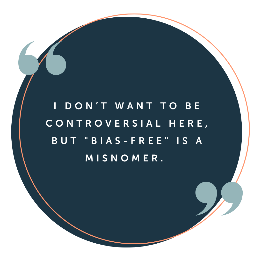 I don’t want to be controversial here, but "bias-free" is a misnomer. People have biases. We all do. Our brains love them because they help us make this infinitely complex world we live in a wee bit simpler to navigate—even if those biases, assumptions, and prejudices aren’t true or just. The best we can do is a bias-conscious process.